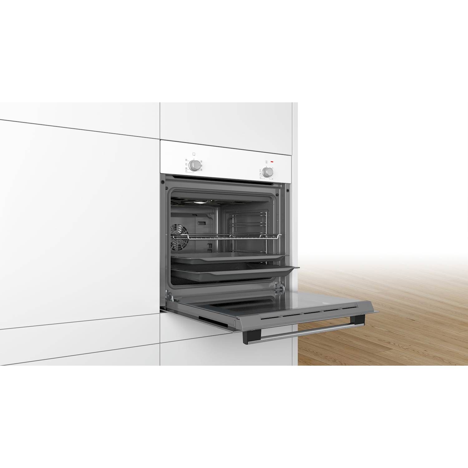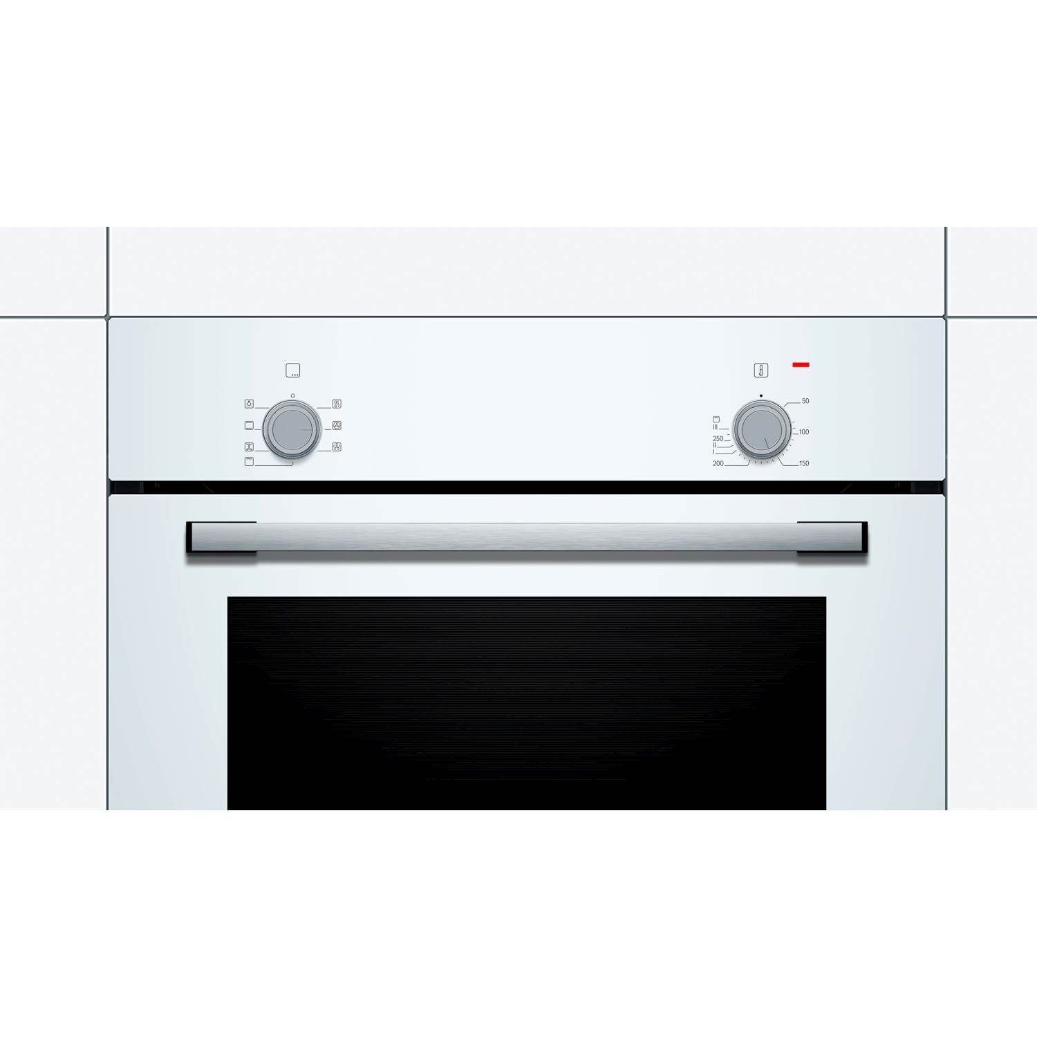Indbygningsovn fra Bosch i hvidt design, med 5 funktioner og ovnrum på 66 liter. Læs hele beskrivelsen