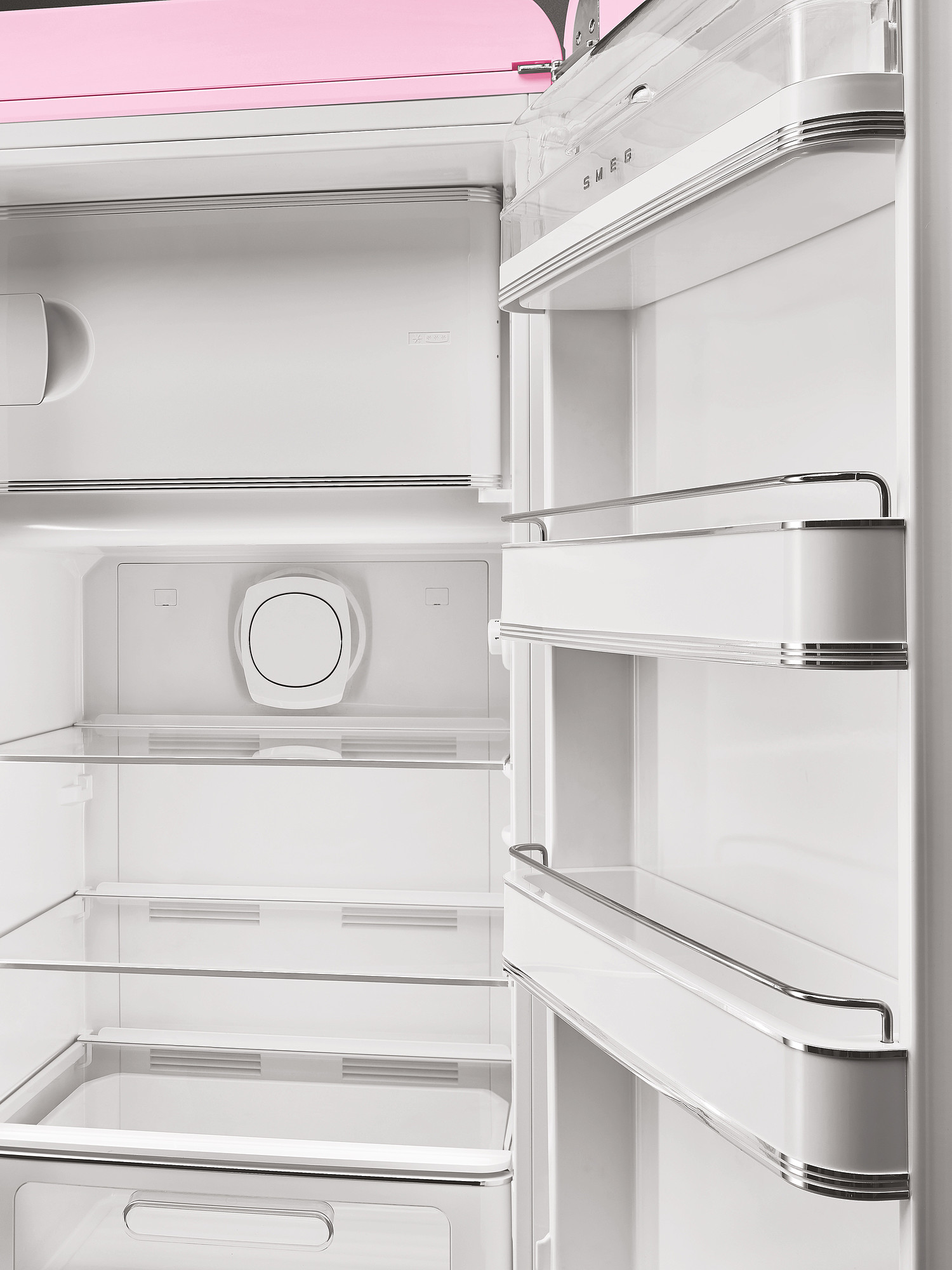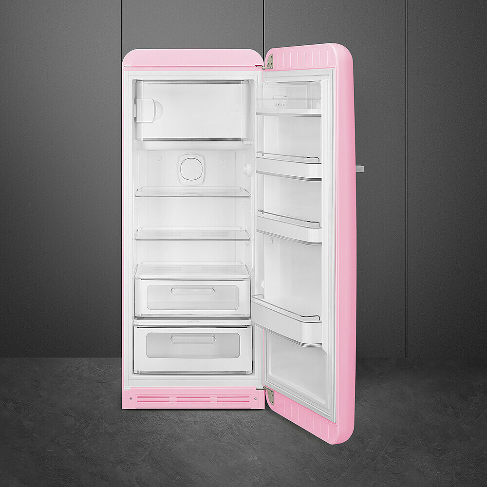 Køleskab fra Smeg i lyserød med fryseboks, grøntsagsskuffe og LED belysning. Læs hele beskrivelsen